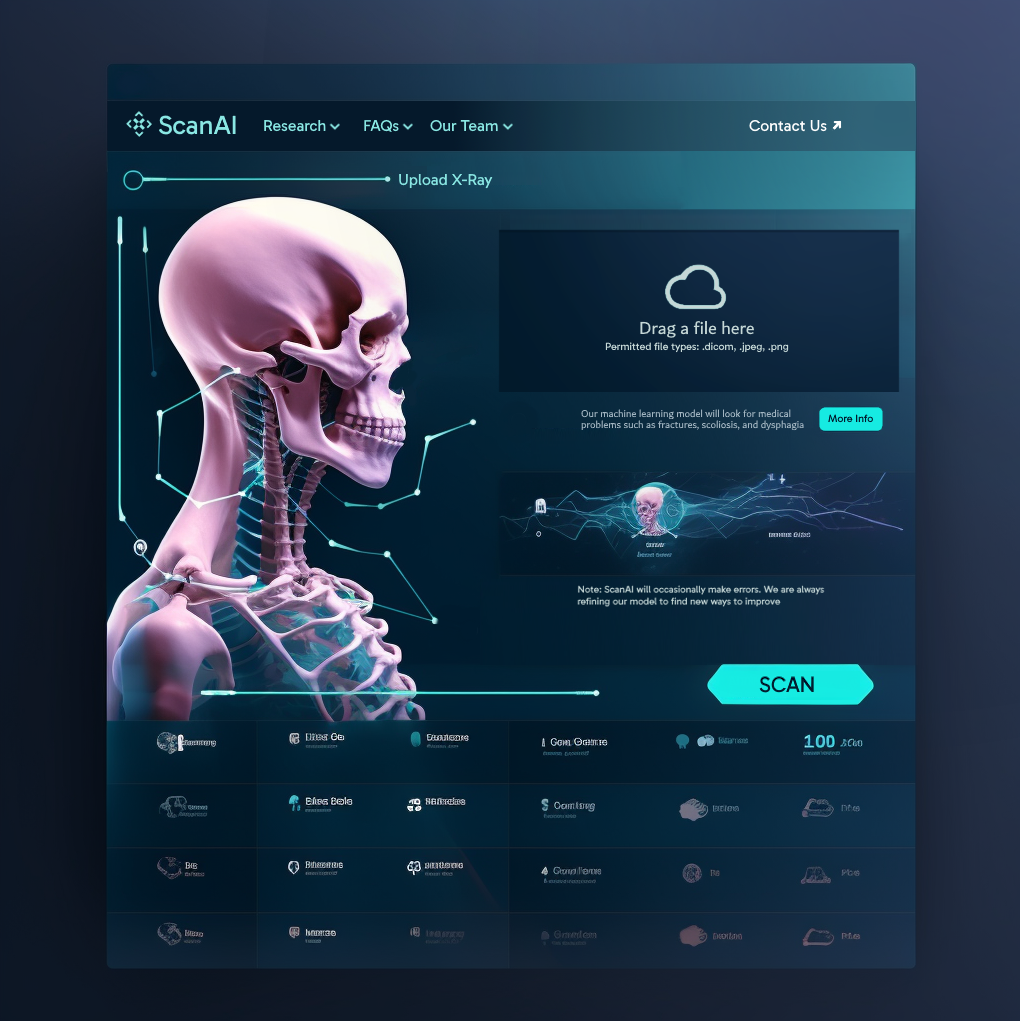 ScanAI is an automated diagnosis system designed to detect scoliosis, bone fractures, and some types of cancers in X-Rays. This technology utilizes machine learning to detect inconsistencies in the pixel data of an uploaded X-Ray.